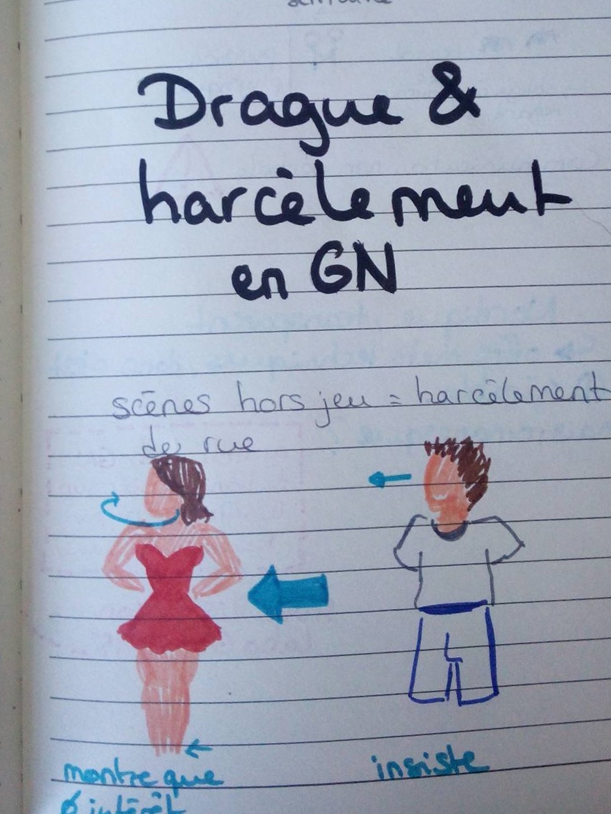 L’été dernier, à Labo-GN, j’ai voulu poursuivre mon travail de réflexion en groupe sur les phénomènes et les effets de la drague et du harcèlement dans la vie et le GN, l’espace-temps du jeu...